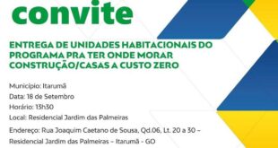 ENTREGA DE 30 UNIDADES HABITACIONAIS DO PROGRAMA PRA TER ONDE MORAR – CASAS A CUSTO ZEROMunicípio: ItarumaData: 18 de setembroHorário: 13h30P Local: Residencial Jardim das Palmeiras→ Endereço: Rua Joaquim Caetano de Sousa, Quadra 06, Lotes 20 a 30 – Residencial Jardim das Palmeiras- Itarumã – GO