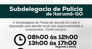 A Subdelegacia de Polícia de Itarumã-GO está à disposição da nossa população!Com atendimento responsável e comprometido, seguimos trabalhando para garantir mais segurança e acolhimento a todos.Horário de atendimento:08h às 12h | 13h às 17h – de segunda a sexta& Contato: (64) 99319-7276Endereço: Avenida São Sebastião, Qd. 49, Lt.18 — CentroPrefeitura …