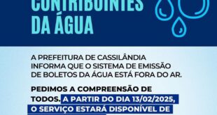 📢 ATENÇÃO, CONTRIBUINTES DA ÁGUA! 💧🚨 A Prefeitura de Cassilândia informa que o sistema de emissão de boletos da água está fora do ar. Pedimos a compreensão de todos. 🔹 A partir do dia 13/02/2025, o serviço estará disponível de forma gradual. 📞 Dúvidas? Entre em contato pelo telefone (67) …