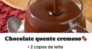 RECEITA DE CHOCOLATE QUENTE CREMOSO!INGREDIENTES:2 xícaras (chá) de leite1 colher (sopa) de amido de milho3 colheres (sopa) de chocolate em pó4 colheres (sopa) de açúcar1 canela em pau1 caixinha de creme de leite MODO DE PREPARO:Em um liquidificador, bata o leite, o amido de milho, o chocolate em pó e …