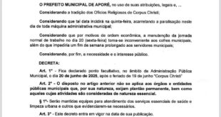 DECRETO Nº 030/2025. “DISPÕE SOBRE A CONCESSÃO DE PONTO FACULTATIVO E DÁ OUTRAS PROVIDÊNCIAS”. Prefeitura Municipal de Aporé.Gestão 2025/2028.