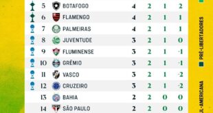 Após a segunda rodada veja com tá seu time no brasileirão 2025.