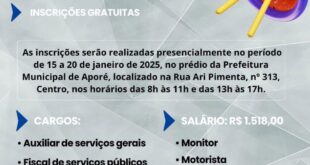 CONFIRA AS INFORMAÇÕES DO PROCESSO SELETIVO SIMPLIFICADO De 15 a 20 de janeiro, das 8 às 11 e das 13 às 17 horas, na Prefeitura Municipal de Aporé, estarão abertas as inscrições para o Processo Seletivo Simplificado. Cargos: auxiliar de serviços gerais, fiscal de serviços públicos, fiscal de Vigilância Sanitária, …