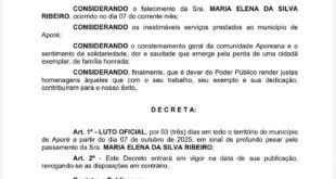 DECRETO N° 043/2025.DISPÕE SOBRE LUTO OFICIAL DE TRÊS DIAS PELO FALECIMENTO DA SRA. MARIA ELENA DASILVA RIBEIRO.Prefeitura Municipal de Aporé.Gestão 2025/2028.