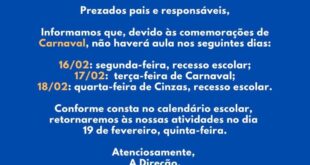 Em razão das comemorações de Carnaval, reforçamos a importância de que os pais e responsáveis atentem-se às informações constantes no comunicado.Solicitamos que se programem conforme as datas indicadas. Em caso de dúvidas, a equipe escolar permanece à disposição para esclarecimentos.Atenciosamente, A Direção.Prefeitura Municipal de Aporé.Gestão 2025/2028.