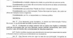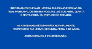 Em razão do feriado, não haverá aulas na rede municipal de ensino nos dias 2 e 3 de abril, quinta e sexta-feira.As atividades retornarão, normalmente, na segunda-feira, 6 de abril.Prefeitura Municipal de Aporé.Gestão 2025/2028.