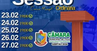 A Câmara Municipal de Itajá convida toda a população para participar da Sessão Ordinária do mês de fevereiro: 23, 24, 25, 26 e 27 de fevereiro Sempre às 19h Plenário da Câmara Municipal Transmissão ao vivo pelo Facebook –Legislativo ItajáSua presença fortalece a democracia e contribui para o desenvolvimento do …