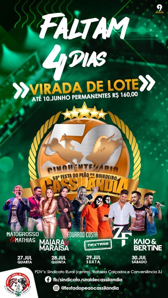 DIA 10/06 ACONTECERÁ A VIRADA DE LOTE DAS PERMANENTES DA 50º FESTA DE PEÃO DE BOIADEIRO DE CASSILÂNDIA-MS Gazeta 06/06/2022 Aporé - GO, Cassilândia - MS, Itajá - GO, Lagoa Santa GO, Últimas Notícias Leave a comment 310 Views Related Articles PROMOÇÃO CENTER MIX 15 horas ago SEBRAE MS GOVERNO DO ESTADO E PREFEITURA LANÇAM PLANO DE DESENVOLVIMENTO MUNICIPAL EM CASSILÂNDIA 21 horas ago QUINTA DA BOA FORMA NA DROGA SOL 21 horas ago Share Facebook Twitter Stumbleupon LinkedIn Pinterest