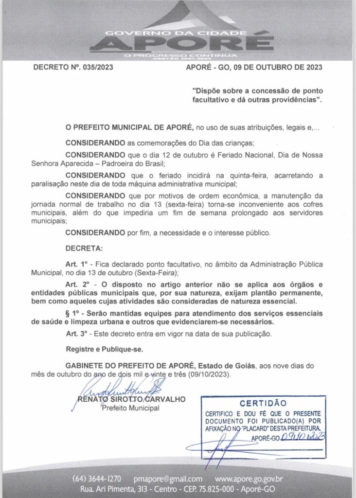 DECRETO Nº 035/2023 Gazeta 10/10/2023 Aporé - GO, Últimas Notícias Leave a comment 171 Views Related Articles TERÇA E QUARTA VERDE NO SUPERMERCADO REZENDE 8 horas ago TERÇA DO HOMEM NA DROGA SOL 12 horas ago CASA DO TRABALHADOR INFORMA 12 horas ago DECRETO Nº 035/2023. DISPÕE SOBRE A CONCESSÃO DE PONTO FACULTATIVO E DÁ OUTRAS PROVIDÊNCIAS. Prefeitura Municipal de Aporé.Gestão 2021/2024. Share Facebook Twitter Stumbleupon LinkedIn Pinterest