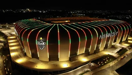 Estádio do Atlético-MG, a Arena MRV, em Belo Horizonte, foi iluminada com as Cores do Rio Grande do Sul neste sábado (4). O Estado do Sul do Brasil vive a maior cheia da história, fato que levou até mesmo ao adiamento de todas as partidas envolvendo clubes da região, seja por competições nacionais ou internacionais.