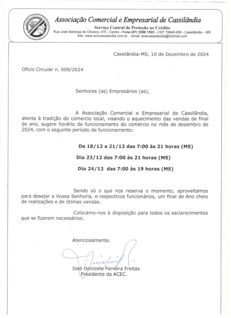 OFÍCIO INFORMATIVO SOBRE OS HORÁRIOS DE ABERTURA DO COMÉRCIO NO FINAL DO ANO Gazeta 12/12/2024 Aporé - GO, Cassilândia - MS, Itajá - GO, Lagoa Santa GO, Últimas Notícias Leave a comment 253 Views Related Articles CASA DO TRABALHADOR INFORMA VAGAS DE EMPREGO 3 horas ago DIA INTERNACIONAL DA MULHER TEM DATA ADIADA EM LAGOA SANTA 3 horas ago CAFÉ DA MANHÃ ESPECIAL NA CÂMARA MUNICIPAL DE APORÉ GOIÁS 3 horas ago Share Facebook Twitter Stumbleupon LinkedIn Pinterest