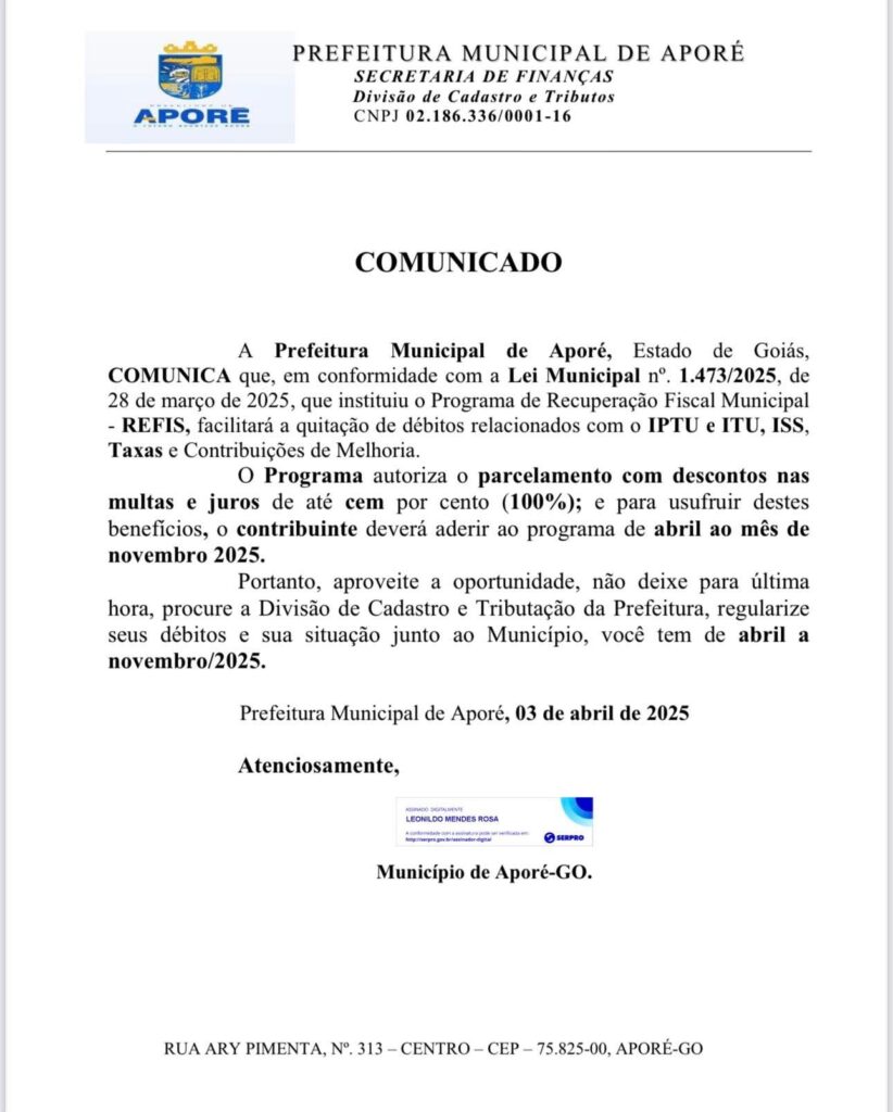 A Prefeitura Municipal de Aporé, Estado de Goiás, COMUNICA que, em conformidade com a Lei Municipal nº. 1.473/2025, de 28 de março de 2025, que instituiu o Programa de Recuperação Fiscal Municipal – REFIS, facilitará a quitação de débitos relacionados com o IPTU e ITU, ISS, Taxas e Contribuições de Melhoria.