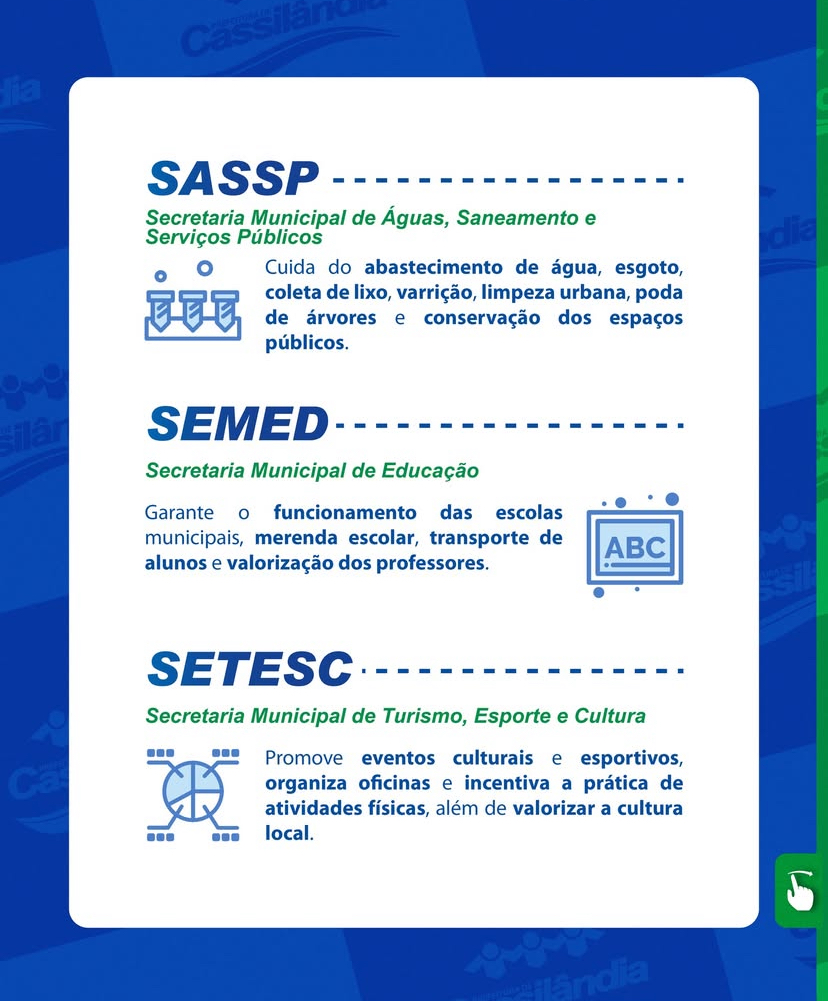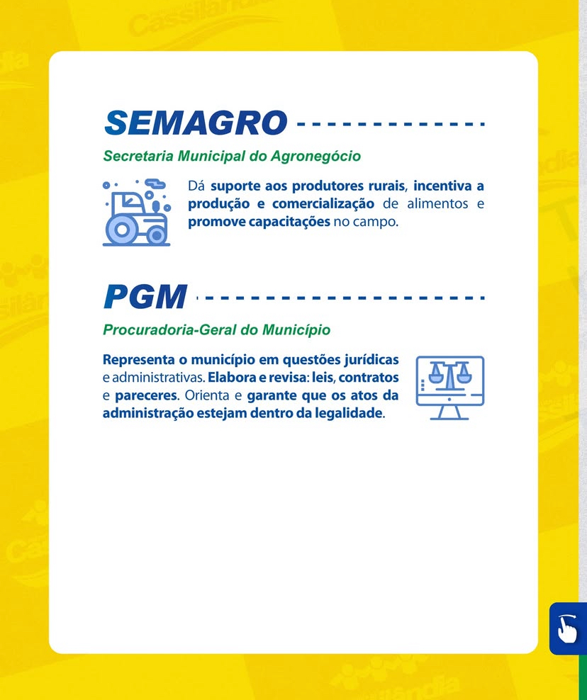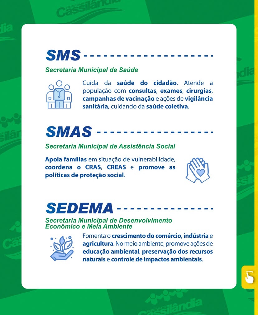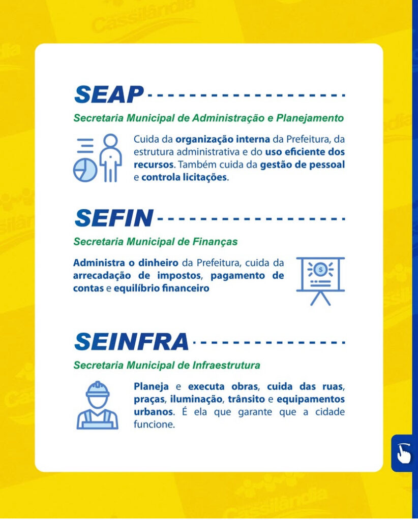 No carrossel a seguir, apresentamos as siglas, os nomes completos e um breve resumo das funções de cada setor da administração municipal.