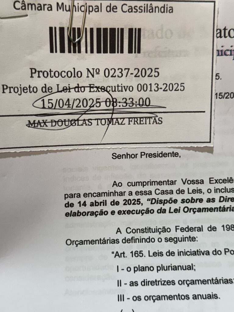 O Município de Cassilândia, por meio do prefeito Rodrigo Barbosa de Freitas, protocolou nesta terça-feira, 15 de abril, o Projeto de Lei de Diretrizes Orçamentárias (LDO) para o exercício de 2026 na Câmara Municipal.