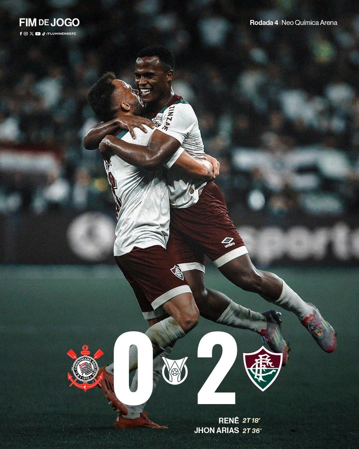 Outra equipe a triunfar fora de casa foi o Fluminense, que bateu o Corinthians em Itaquera por 2 a 0 e ocupa a 3ª colocação com nove pontos. Os gols do Fluminense foram marcados pelo lateral Renê e pelo meio-campista Arias. Após o revés, o Timão ocupa a 13ª posição com quatro pontos.