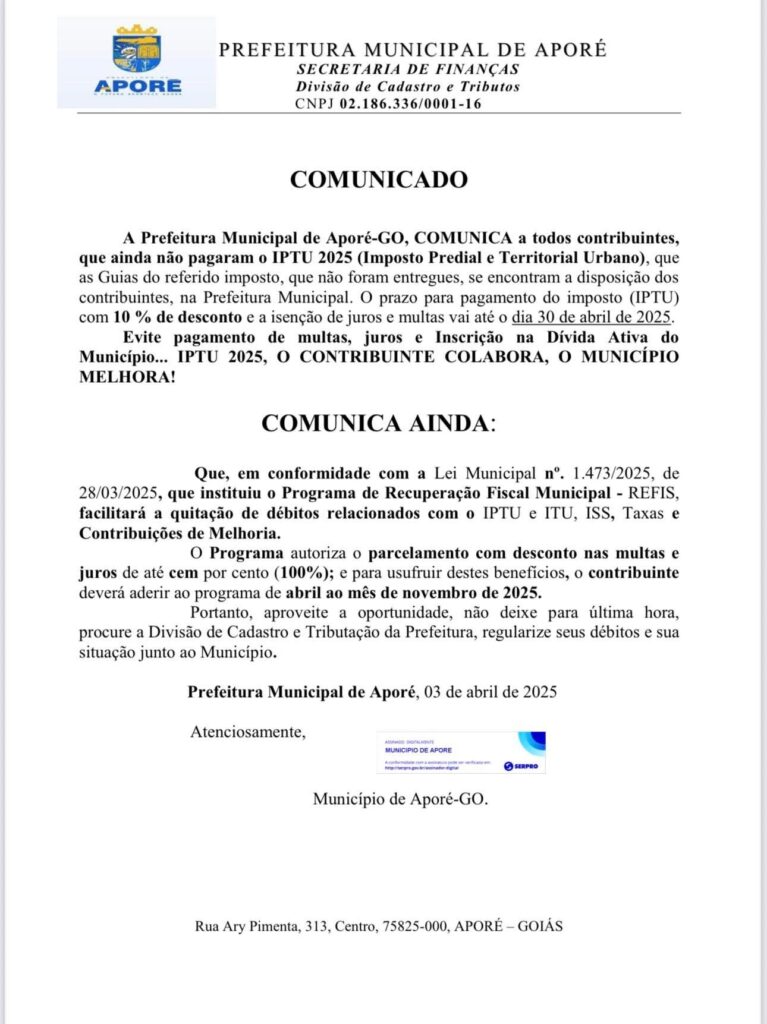COMUNICADO IPTU Gazeta 28/04/2025 Aporé - GO, Últimas Notícias Leave a comment 135 Views Related Articles MÊS DO CONSUMIDOR NO SUPERMERCADO MASTER LOJAS 1 E 2 12 horas ago OFERTAS DIA DA MULHER NO SUPERMERCADO REZENDE 12 horas ago 1° PAGODE COM FEIJOADA EM LAGOA SANTA 12 horas ago Share Facebook Twitter Stumbleupon LinkedIn Pinterest