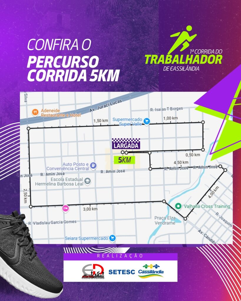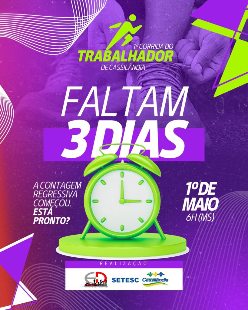 A Prefeitura de Cassilândia, por meio da Secretaria de Turismo, Cultura, Esporte e Lazer, realizará no dia 1º de maio a tradicional Corrida do Trabalhador. A largada será em frente ao Banco do Brasil, no centro da cidade, às 7h (MS). Foram 212 inscritos.