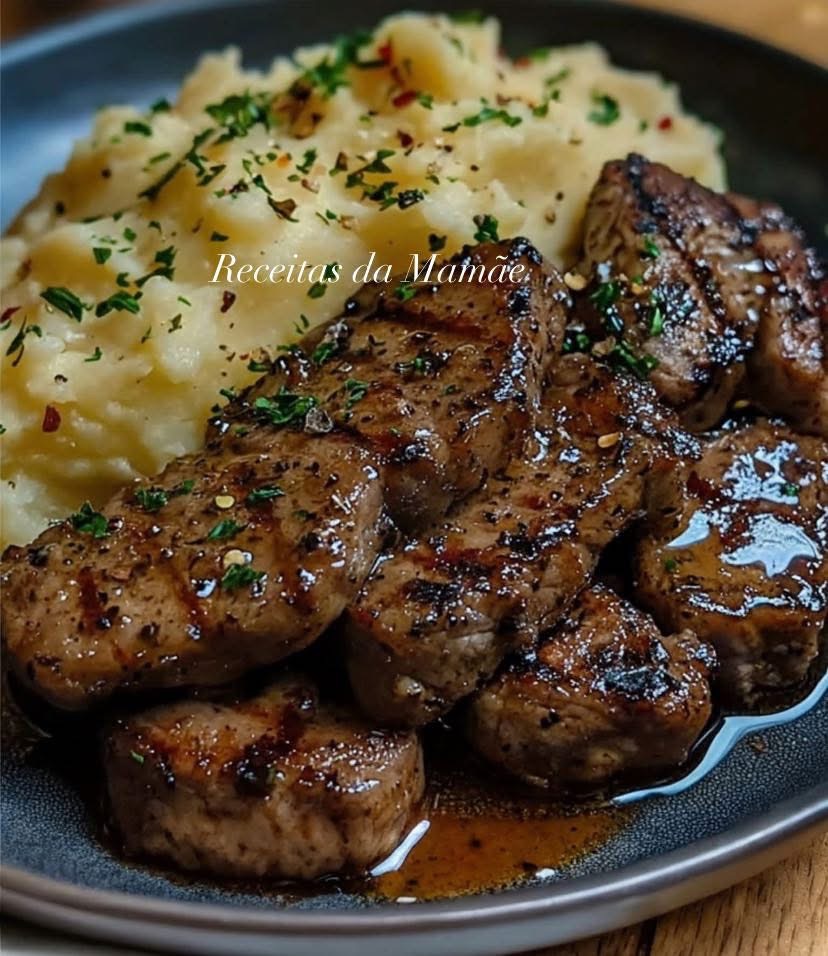 PICADAS DE CARNE COM MANTEIGA DE ALHO E PURÊ DE BATATA CREMOSO