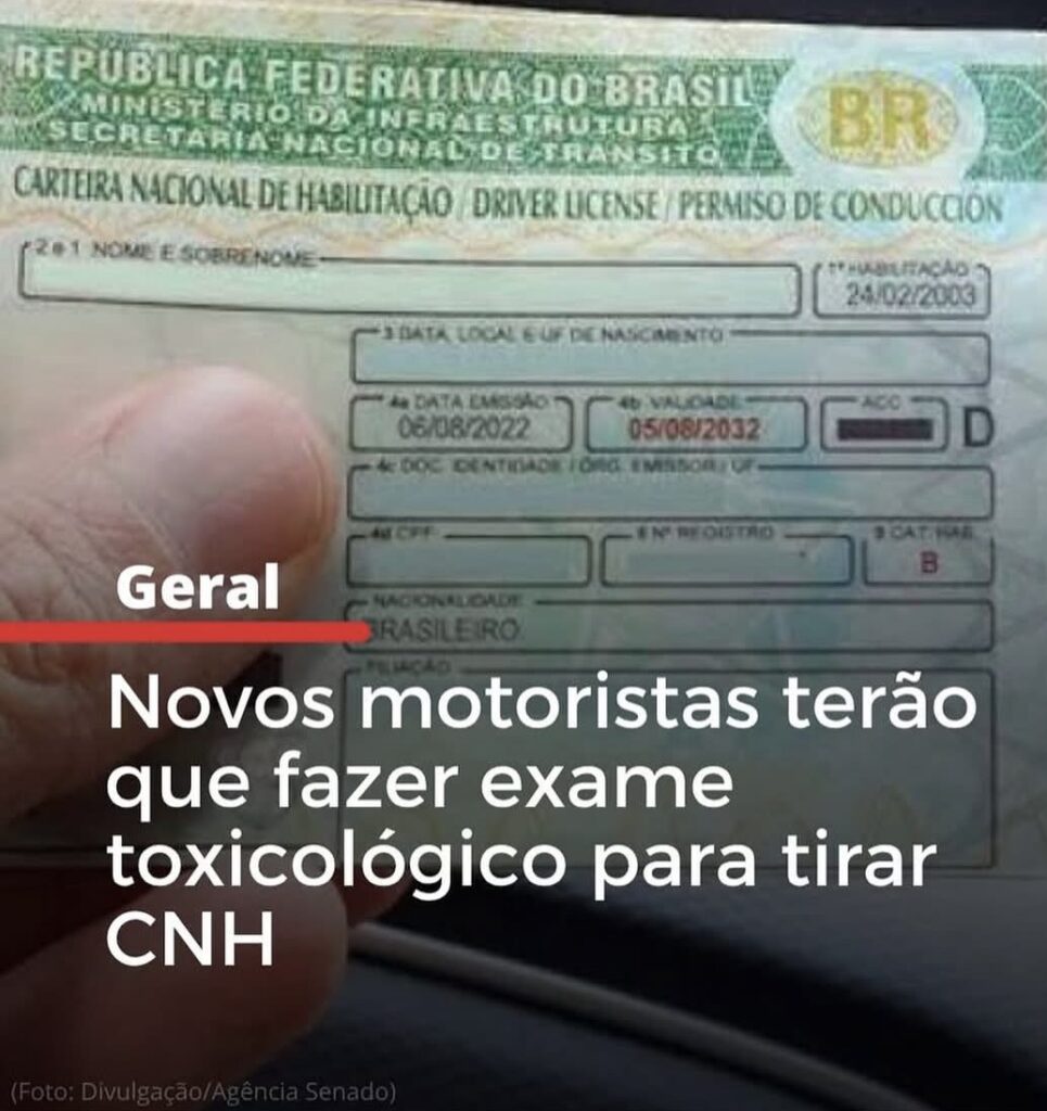 Exame toxicológico – Quem for tirar a primeira habilitação para motos (categoria A) e carros (categoria B) terá que apresentar exame toxicológico com resultado negativo, com análise retrospectiva mínima de 90 dias. A nova regra faz parte do projeto de lei aprovado nesta semana pelo Congresso Nacional.