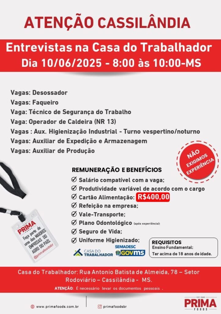 Amanhã tem entrevista da empresa Prima Foods às 8hs MS, Casa do Trabalhador