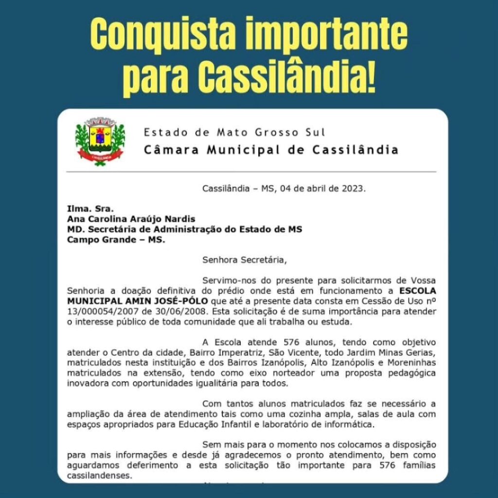 É com muita alegria que compartilho com vocês uma grande vitória para o nosso município: o Governo do Estado publicou a Lei que oficializa a doação do prédio da antiga Escola Estadual Marechal Rondon, Prédio que hoje funciona a atual escola Municipal Amin José.