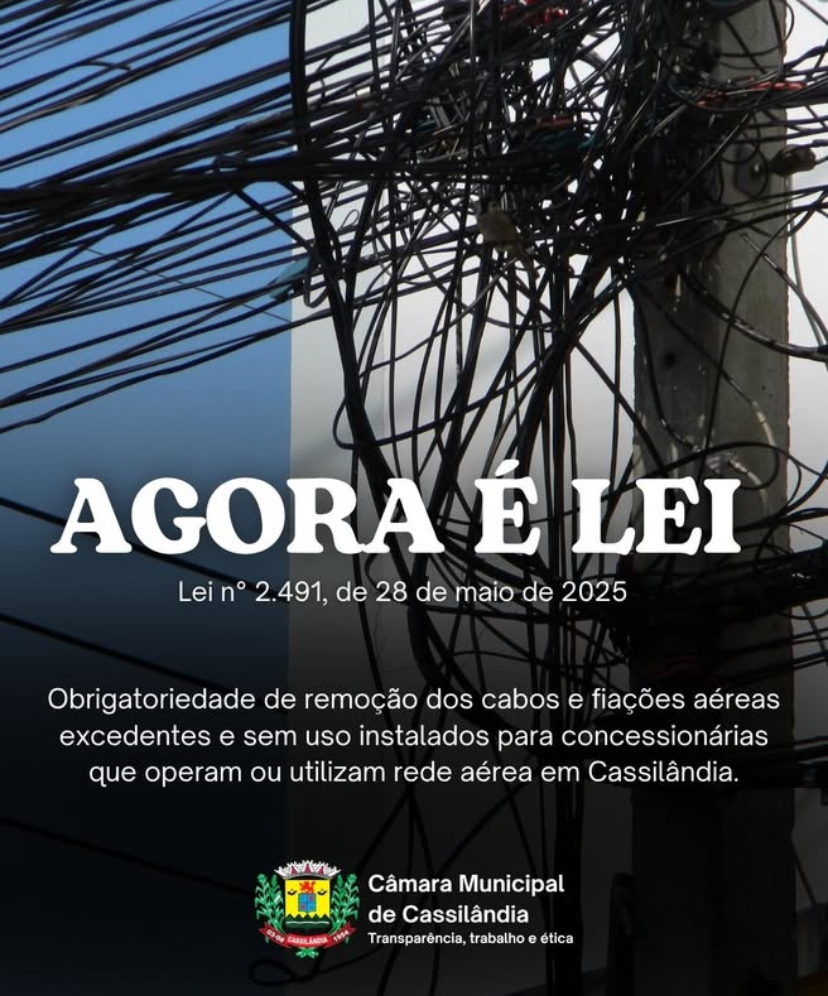Lei obriga a remoção dos cabos e fiações aéreas excedentes e sem uso instalados para concessionárias que operam ou utilizam rede aérea em Cassilândia.