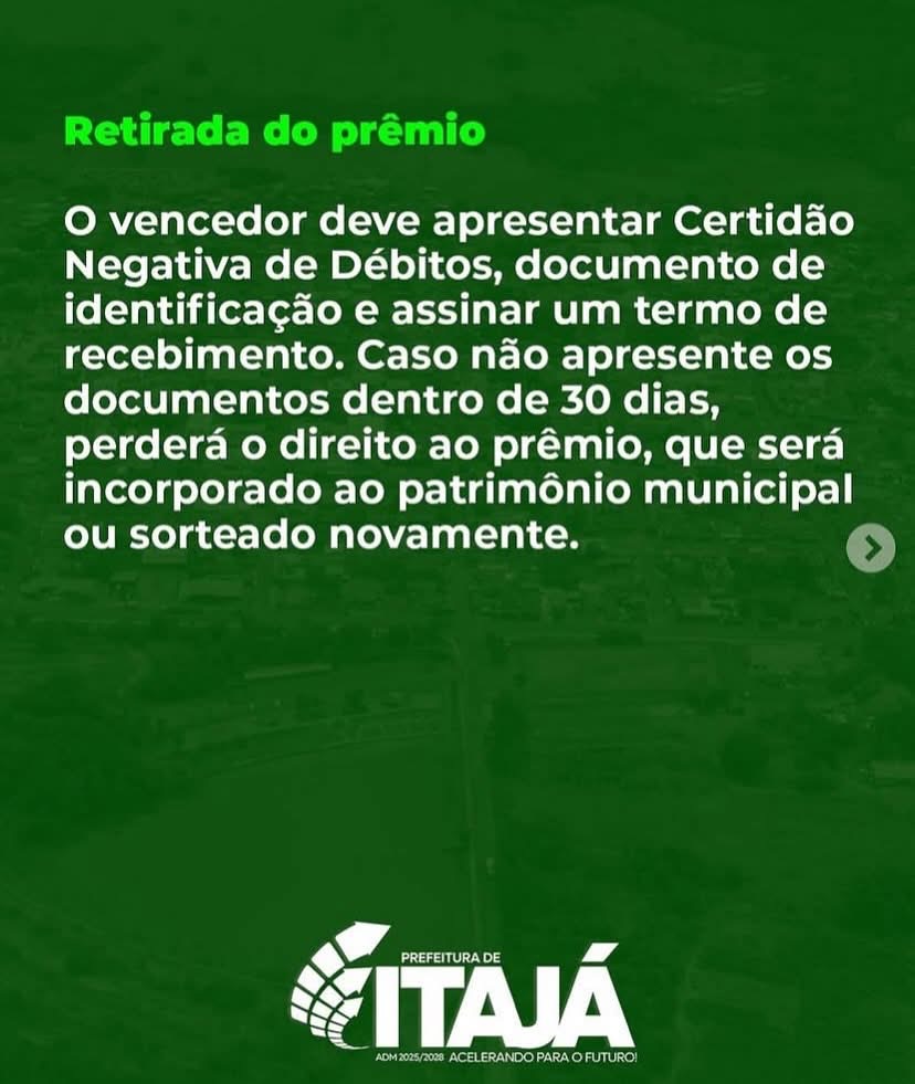 Em novembro, durante as comemorações do aniversário de Itajá. Esteja em dia com suas obrigações e concorra!