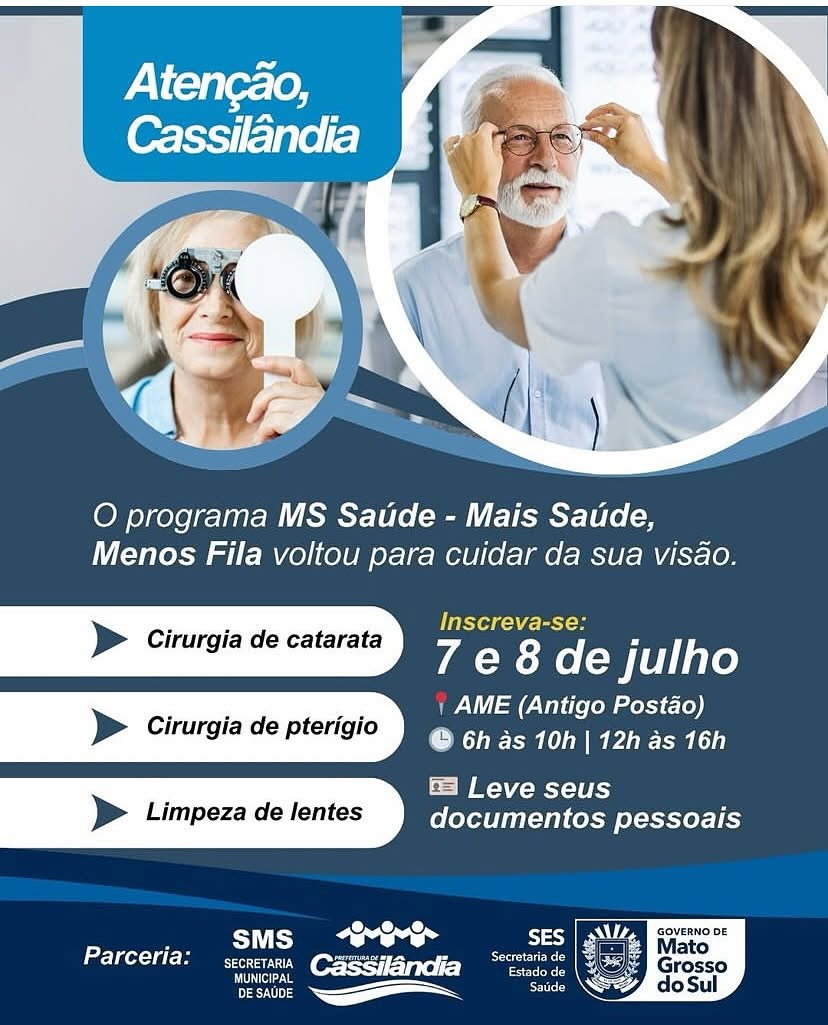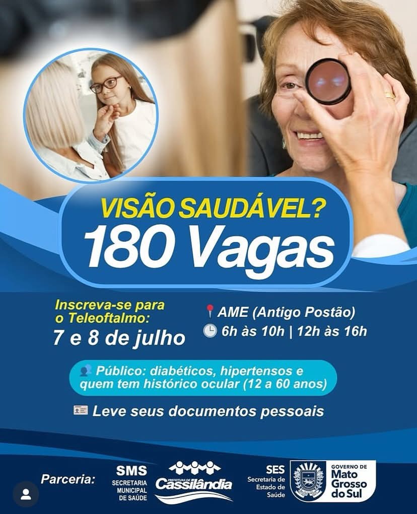 Nos dias 7 e 8 de julho, acontecerá no AME – Antigo Postão, a inscrição para o Teleoftalmo, um programa gratuito voltado à saúde da visão, especialmente para quem tem risco de desenvolver problemas visuais, incluindo cegueira.