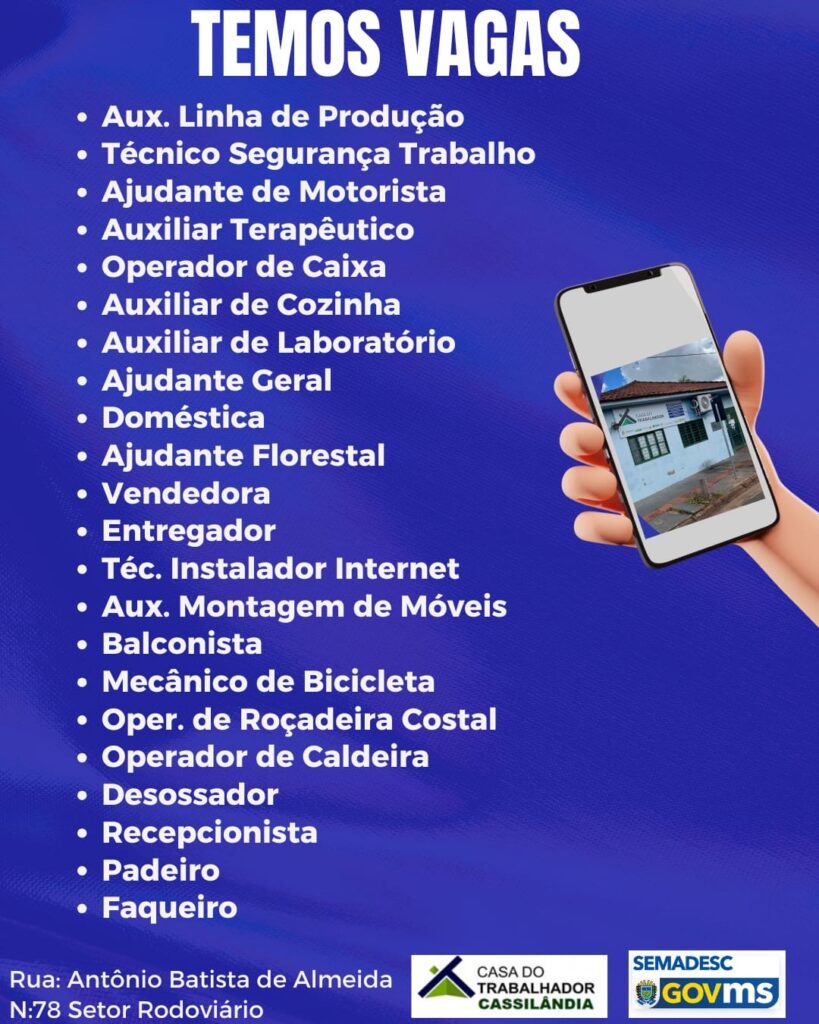 VAGAS DISPONÍVEIS NA CASA DO TRABALHADOR Gazeta 10/07/2025 Cassilândia - MS, Últimas Notícias Leave a comment 59 Views Related Articles PREFEITURA MUNICIPAL DE CASSILÂNDIA INSTALA NOVAS PLACAS DE SINALIZAÇÃO NO SALTO DO RIO APORÉ 22 horas ago CAMPANHA DO AGASALHO EM APORÉ 22 horas ago GRANDE CAVALGADA EM APARECIDA DO TABOADO 22 horas ago Share Facebook Twitter Stumbleupon LinkedIn Pinterest