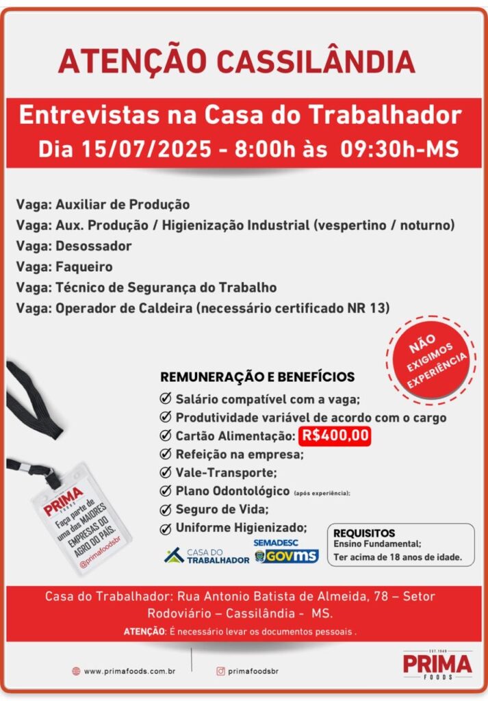 ATENÇÃO CASSILÂNDIA VAGAS DE EMPREGOS NA CASA DO TRABALHADOR Gazeta 15/07/2025 Cassilândia - MS, Últimas Notícias Leave a comment 70 Views Related Articles TERÇA E QUARTA VERDE NO SUPERMERCADO REZENDE 17 horas ago TERÇA DO HOMEM NA DROGA SOL 20 horas ago CASA DO TRABALHADOR INFORMA 21 horas ago Share Facebook Twitter Stumbleupon LinkedIn Pinterest