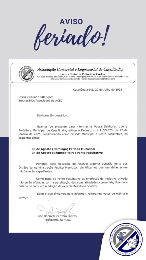 ASSOCIAÇÃO COMERCIAL E EMPRESARIAL DE CASSILÂNDIA INFORMA Gazeta 30/07/2025 Cassilândia - MS, Últimas Notícias Leave a comment 111 Views Related Articles PREFEITURA MUNICIPAL DE CASSILÂNDIA INSTALA NOVAS PLACAS DE SINALIZAÇÃO NO SALTO DO RIO APORÉ 7 horas ago CAMPANHA DO AGASALHO EM APORÉ 7 horas ago GRANDE CAVALGADA EM APARECIDA DO TABOADO 7 horas ago Share Facebook Twitter Stumbleupon LinkedIn Pinterest