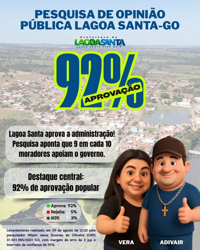 Pesquisa aponta 92% aprovação da gestão do prefeito Adivair e sua vice Vera de Lagoa Santa Gazeta 11/08/2025 Lagoa Santa GO, Últimas Notícias Leave a comment 114 Views Related Articles TERÇA DO HOMEM NA DROGA SOL 3 horas ago CASA DO TRABALHADOR INFORMA 4 horas ago 6° ENCONTRO DE CARROS ANTIGOS EM CAÇU 4 horas ago Share Facebook Twitter Stumbleupon LinkedIn Pinterest