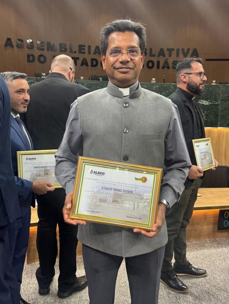 O Padre de Aporé Joseph Thekkell recebeu ontem o Certificado de Mérito Legislativo Pedro Ludovico, concedido pela Assembleia Legislativa de Goiás, por propositura do deputado Bruno Peixoto. Que esta homenagem seja reflexo do serviço e da missão que a Igreja realiza em favor do povo de Deus.
