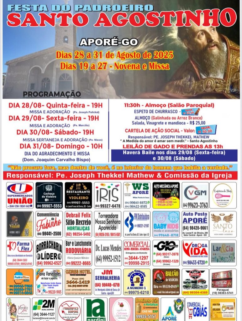 FESTA DO PADROEIRO SANTO AGOSTINHO EM APORÉ Gazeta 19/08/2025 Aporé - GO, Últimas Notícias Leave a comment 125 Views Related Articles CASA DO TRABALHADOR INFORMA 15 horas ago COMUNICADO EDUCAÇÃO EM APORE 15 horas ago CÂMARA MUNICIPAL DE ITAJÁ ABRIU TRABALHO LEGISLATIVO NO MÊS DE FEVEREIRO 15 horas ago Share Facebook Twitter Stumbleupon LinkedIn Pinterest