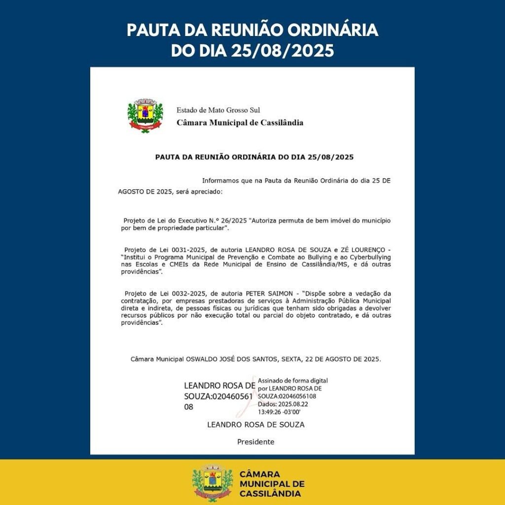 CÂMARA DE CASSILÂNDIA INFORMA DIA DA SESSÃO E PAUTA Gazeta 23/08/2025 Cassilândia - MS, Últimas Notícias Leave a comment 71 Views Related Articles PREFEITURA MUNICIPAL DE CASSILÂNDIA INSTALA NOVAS PLACAS DE SINALIZAÇÃO NO SALTO DO RIO APORÉ 15 horas ago CAMPANHA DO AGASALHO EM APORÉ 15 horas ago GRANDE CAVALGADA EM APARECIDA DO TABOADO 15 horas ago Share Facebook Twitter Stumbleupon LinkedIn Pinterest