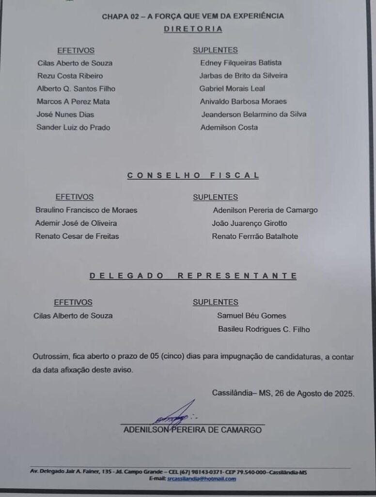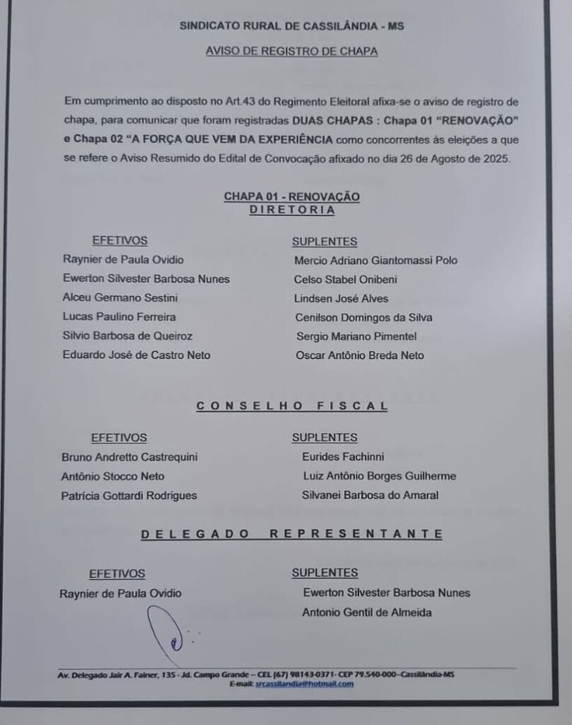CHAPAS QUE VÃO DISPUTAR A PRESIDÊNCIA DO SINDICATO RURAL DE CASSILÂNDIA Gazeta 30/08/2025 Cassilândia - MS, Últimas Notícias Leave a comment 150 Views Related Articles TERÇA DO HOMEM NA DROGA SOL 3 horas ago CASA DO TRABALHADOR INFORMA 3 horas ago 6° ENCONTRO DE CARROS ANTIGOS EM CAÇU 3 horas ago Chapas que vão disputar a presidência do sindicato Rural de Cassilândia no próximo dia 13. Share Facebook Twitter Stumbleupon LinkedIn Pinterest