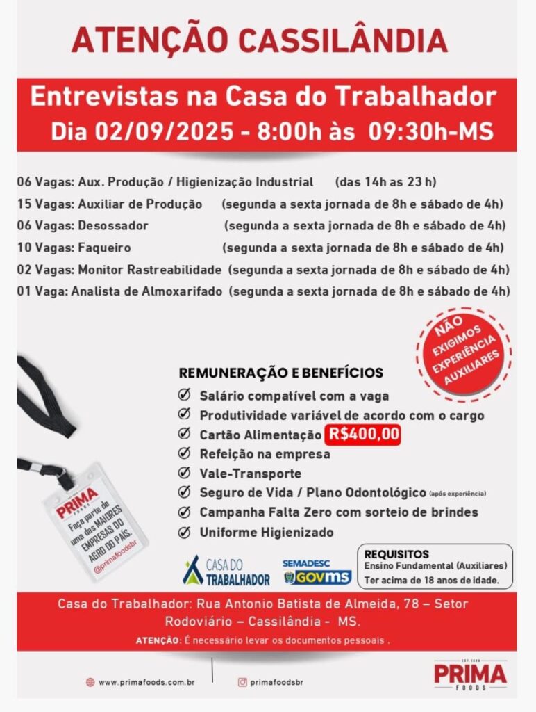 OPORTUNIDADES DE EMPREGOS Gazeta 01/09/2025 Cassilândia - MS, Últimas Notícias Leave a comment 97 Views Related Articles Balneário Salto do Rio Aporé vira palco de grandes disputas no motocross e atrai pilotos de três estados 13 horas ago CASA DO TRABALHADOR INFORMA VAGAS DE EMPREGO 16 horas ago DIA INTERNACIONAL DA MULHER TEM DATA ADIADA EM LAGOA SANTA 16 horas ago Share Facebook Twitter Stumbleupon LinkedIn Pinterest