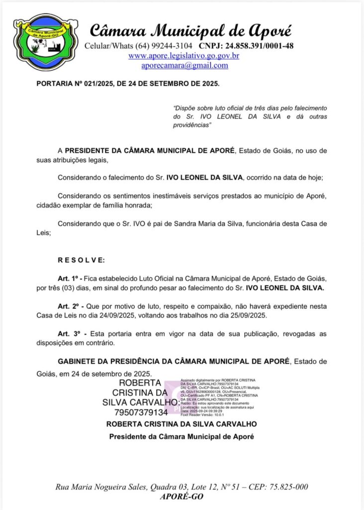 A Presidente da Câmara Municipal de Aporé, Roberta Carvalho Comunica a todos que devido a triste notícia do falecimento do Sr Ivo pai de uma servidora desta Casa de Leis.