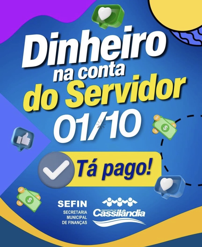 A Prefeitura de Cassilândia, por meio da Secretaria Municipal de Finanças (SEFIN), informa que o pagamento dos salários referentes ao mês de setembro já está na conta dos servidores nesta quarta-feira, 01 de outubro.