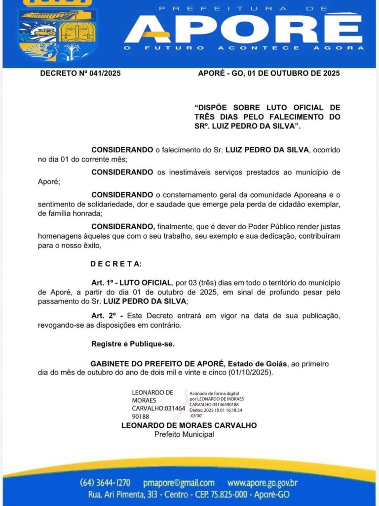 PREFEITURA MUNICIPAL DE APORÉ INFORMA Gazeta 02/10/2025 Aporé - GO, Últimas Notícias Leave a comment 115 Views Related Articles PROMOÇÃO CENTER MIX 4 horas ago SEBRAE MS GOVERNO DO ESTADO E PREFEITURA LANÇAM PLANO DE DESENVOLVIMENTO MUNICIPAL EM CASSILÂNDIA 10 horas ago QUINTA DA BOA FORMA NA DROGA SOL 10 horas ago DECRETO Nº 041/2025. DISPÕE SOBRE LUTO OFICIAL DE TRÊS DIAS PELO FALECIMENTO DO SR°. LUIZ PEDRO DA SILVA. Prefeitura Municipal de Aporé.Gestão 2025/2028. Share Facebook Twitter Stumbleupon LinkedIn Pinterest