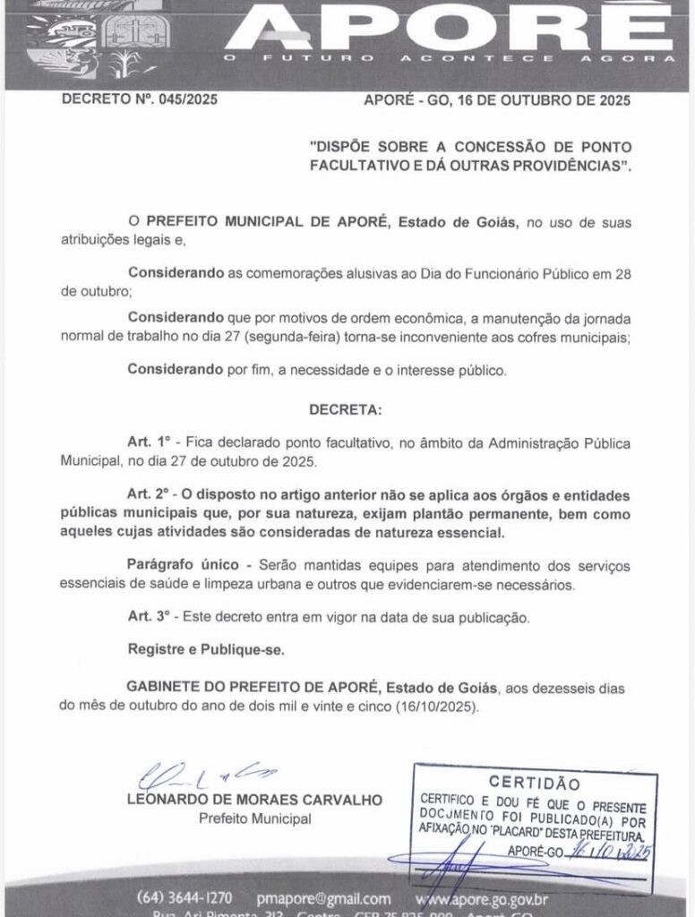 PREFEITURA MUNICIPAL DE APORÉ INFORMA Gazeta 18/10/2025 Aporé - GO, Últimas Notícias Leave a comment 106 Views Related Articles PROMOÇÃO CENTER MIX 9 horas ago SEBRAE MS GOVERNO DO ESTADO E PREFEITURA LANÇAM PLANO DE DESENVOLVIMENTO MUNICIPAL EM CASSILÂNDIA 15 horas ago QUINTA DA BOA FORMA NA DROGA SOL 16 horas ago DECRETO N° 045/2025. DISPÕE SOBRE A CONCESSÃO DE PONTO FACULTATIVO E DÁ OUTRAS PROVIDÊNCIAS. Prefeitura Municipal de Aporé. Gestão 2025/2028. Screenshot Share Facebook Twitter Stumbleupon LinkedIn Pinterest