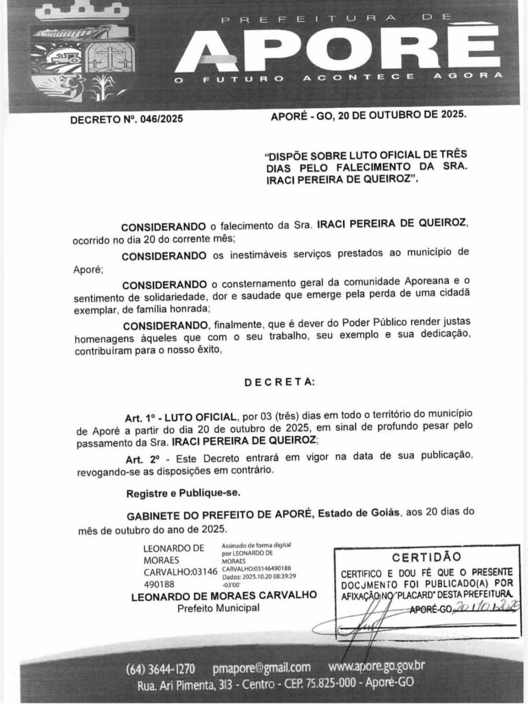 PREFEITURA MUNICIPAL DE APORE INFORMA Gazeta 20/10/2025 Aporé - GO, Últimas Notícias Leave a comment 134 Views Related Articles PROMOÇÃO CENTER MIX 9 horas ago SEBRAE MS GOVERNO DO ESTADO E PREFEITURA LANÇAM PLANO DE DESENVOLVIMENTO MUNICIPAL EM CASSILÂNDIA 15 horas ago QUINTA DA BOA FORMA NA DROGA SOL 16 horas ago DECRETO N° 046/2025.DISPÕE SOBRE LUTO OFICIAL DE TRÊS DIASPELO FALECIMENTO DA SRA. IRACI PEREIRA DE QUEIROZ.Prefeitura Municipal de Aporé.Gestão 2025/2028. Share Facebook Twitter Stumbleupon LinkedIn Pinterest