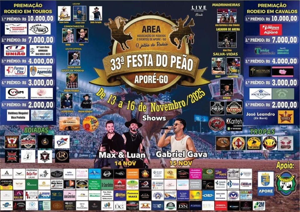 33ª FESTA DO PEÃO DE APORÉ-GO Gazeta 27/10/2025 Aporé - GO, Últimas Notícias Leave a comment 64 Views Related Articles PREFEITURA MUNICIPAL DE CASSILÂNDIA INSTALA NOVAS PLACAS DE SINALIZAÇÃO NO SALTO DO RIO APORÉ 17 horas ago CAMPANHA DO AGASALHO EM APORÉ 17 horas ago GRANDE CAVALGADA EM APARECIDA DO TABOADO 18 horas ago Share Facebook Twitter Stumbleupon LinkedIn Pinterest