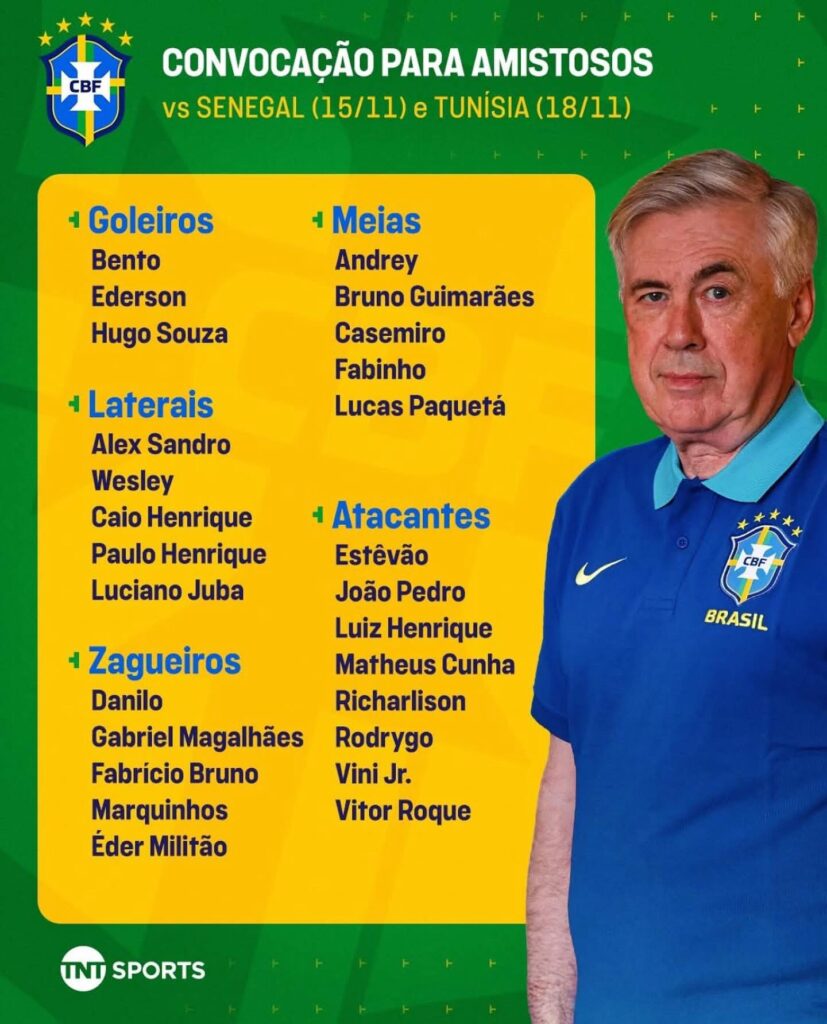 Veja a convocação da Seleção Brasileira pros jogos contra Senegal e Tunísia.