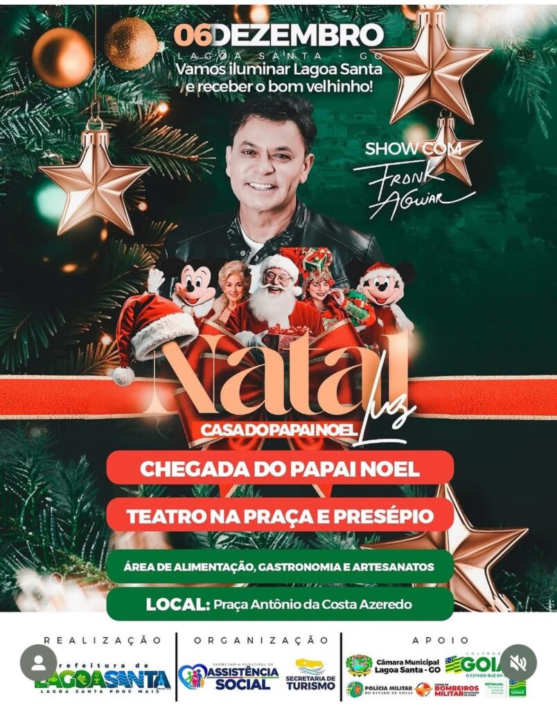 E para deixar a noite ainda mais especial, teremos um grande show com Frank Aguiar! Local: Praça Antônio da Costa Azeredo Venha viver esse momento mágico com sua família e celebrar o espírito natalino!