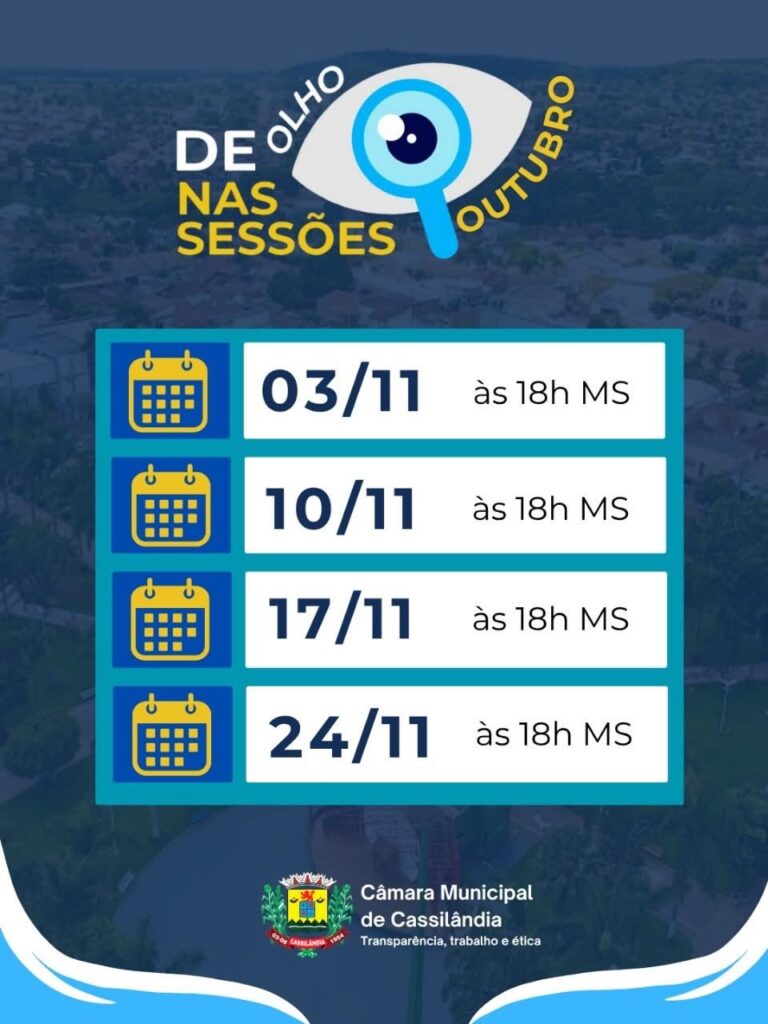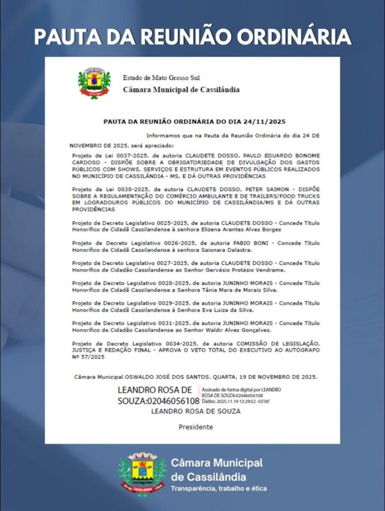 CÂMARA MUNICIPAL DE CASSILÂNDIA INFORMA SESSÃO Gazeta 23/11/2025 Cassilândia - MS, Últimas Notícias Leave a comment 59 Views Related Articles PREFEITURA MUNICIPAL DE CASSILÂNDIA INSTALA NOVAS PLACAS DE SINALIZAÇÃO NO SALTO DO RIO APORÉ 20 horas ago CAMPANHA DO AGASALHO EM APORÉ 20 horas ago GRANDE CAVALGADA EM APARECIDA DO TABOADO 20 horas ago Share Facebook Twitter Stumbleupon LinkedIn Pinterest