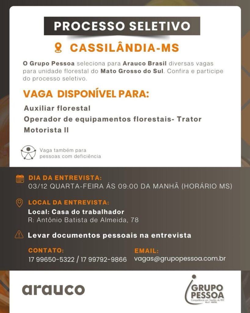 GRUPO PESSOA INFORMA VAGAS DE EMPREGO E ENTREVISTAS NA CASA DO TRABALHADOR EM CASSILÂNDIA AMANHÃ Gazeta 02/12/2025 Cassilândia - MS, Últimas Notícias Leave a comment 87 Views Related Articles PREFEITURA MUNICIPAL DE CASSILÂNDIA INSTALA NOVAS PLACAS DE SINALIZAÇÃO NO SALTO DO RIO APORÉ 23 horas ago CAMPANHA DO AGASALHO EM APORÉ 23 horas ago GRANDE CAVALGADA EM APARECIDA DO TABOADO 23 horas ago Share Facebook Twitter Stumbleupon LinkedIn Pinterest