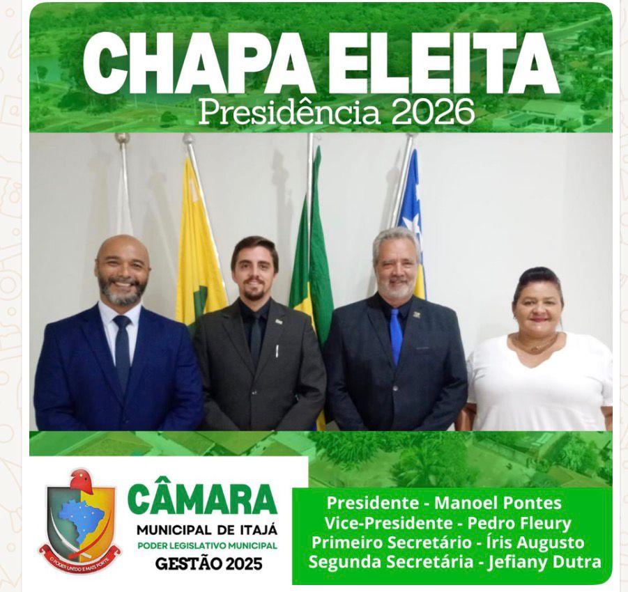 A Câmara de Vereadores realizou a eleição da mesa diretora para 2026. A chapa única foi eleita e composta por Manoel Pontes (Presidente), Pedro Fleury (Vice-Presidente), Íris Augusto (Primeiro Secretário) e Jefiany Dutra (Segunda Secretária). Parabéns à nova direção!