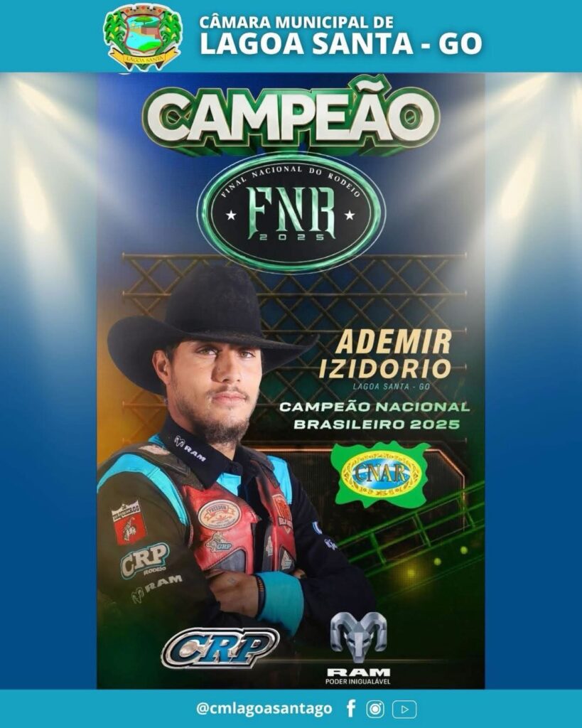 A Câmara Municipal de Lagoa Santa parabeniza, com grande orgulho, o atleta Ademir Izidoro pela brilhante conquista do Campeonato Nacional de Rodeio 2025, consagrando-se campeão brasileiro na Final Nacional do Rodeio.
