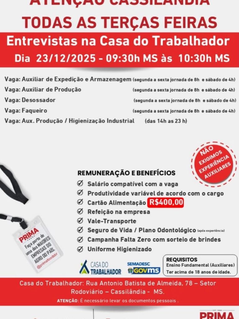 CASA DO TRABALHADOR INFORMA VAGAS DE EMPREGO Gazeta 17/12/2025 Cassilândia - MS, Últimas Notícias Leave a comment 59 Views Related Articles CASA DO TRABALHADOR INFORMA 15 horas ago COMUNICADO EDUCAÇÃO EM APORE 15 horas ago CÂMARA MUNICIPAL DE ITAJÁ ABRIU TRABALHO LEGISLATIVO NO MÊS DE FEVEREIRO 15 horas ago Share Facebook Twitter Stumbleupon LinkedIn Pinterest